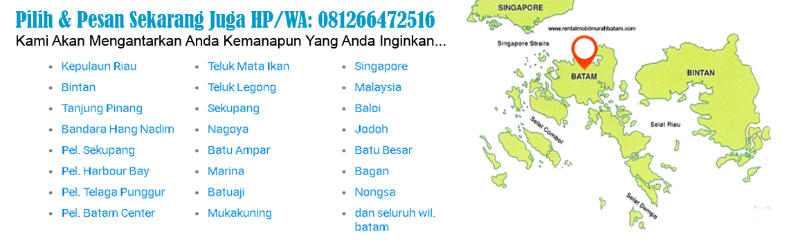 Kami melayani jasa sewa/rental mobil termurah di seluruh wilayah batam, kepulauan riau. Wilayah Kota Batam terdiri dari Pulau Batam, Pulau Rempang dan Pulau Galang dan pulau-pulau kecil lainnya di kawasan Selat Singapura dan Selat Malaka.